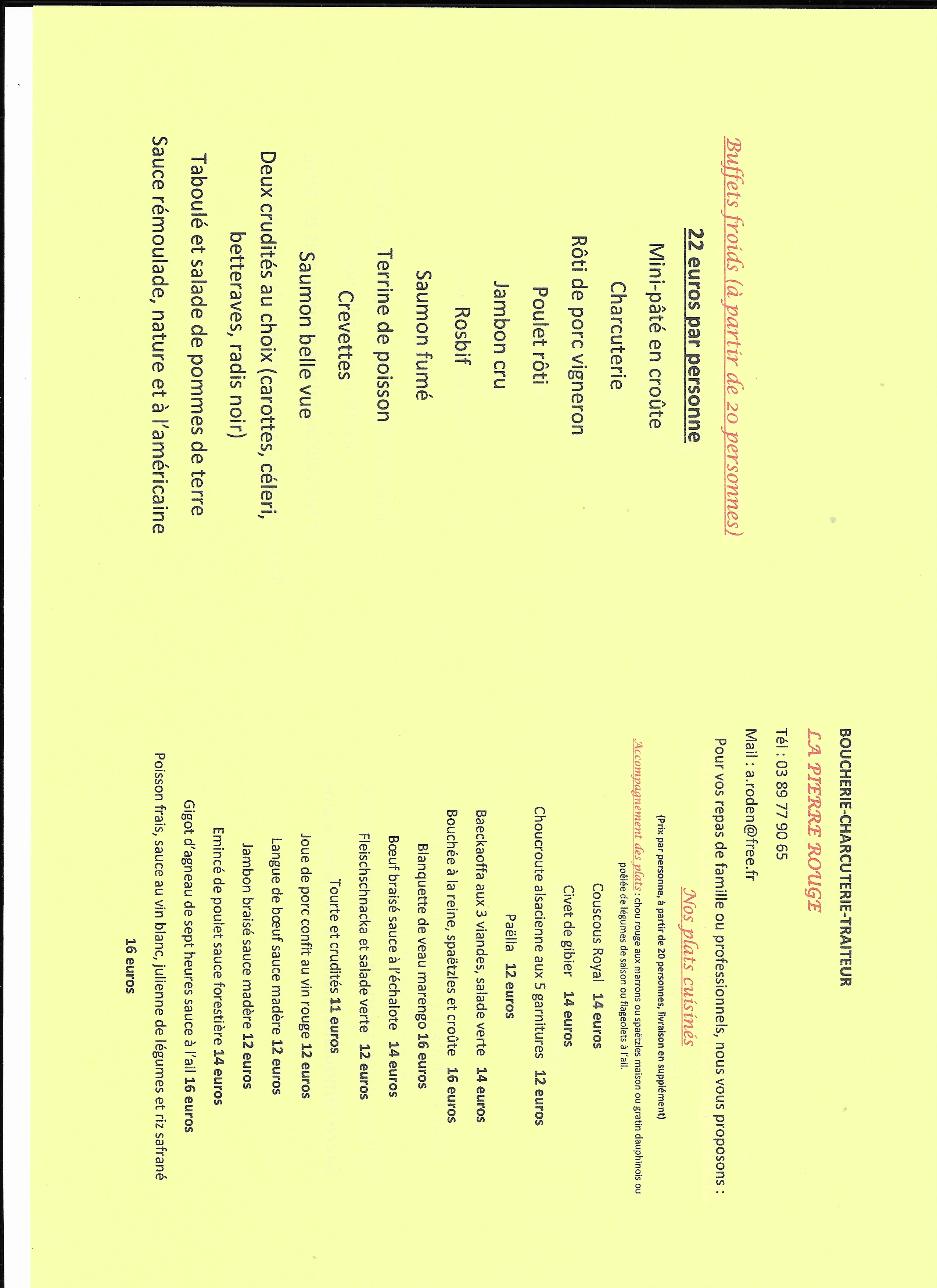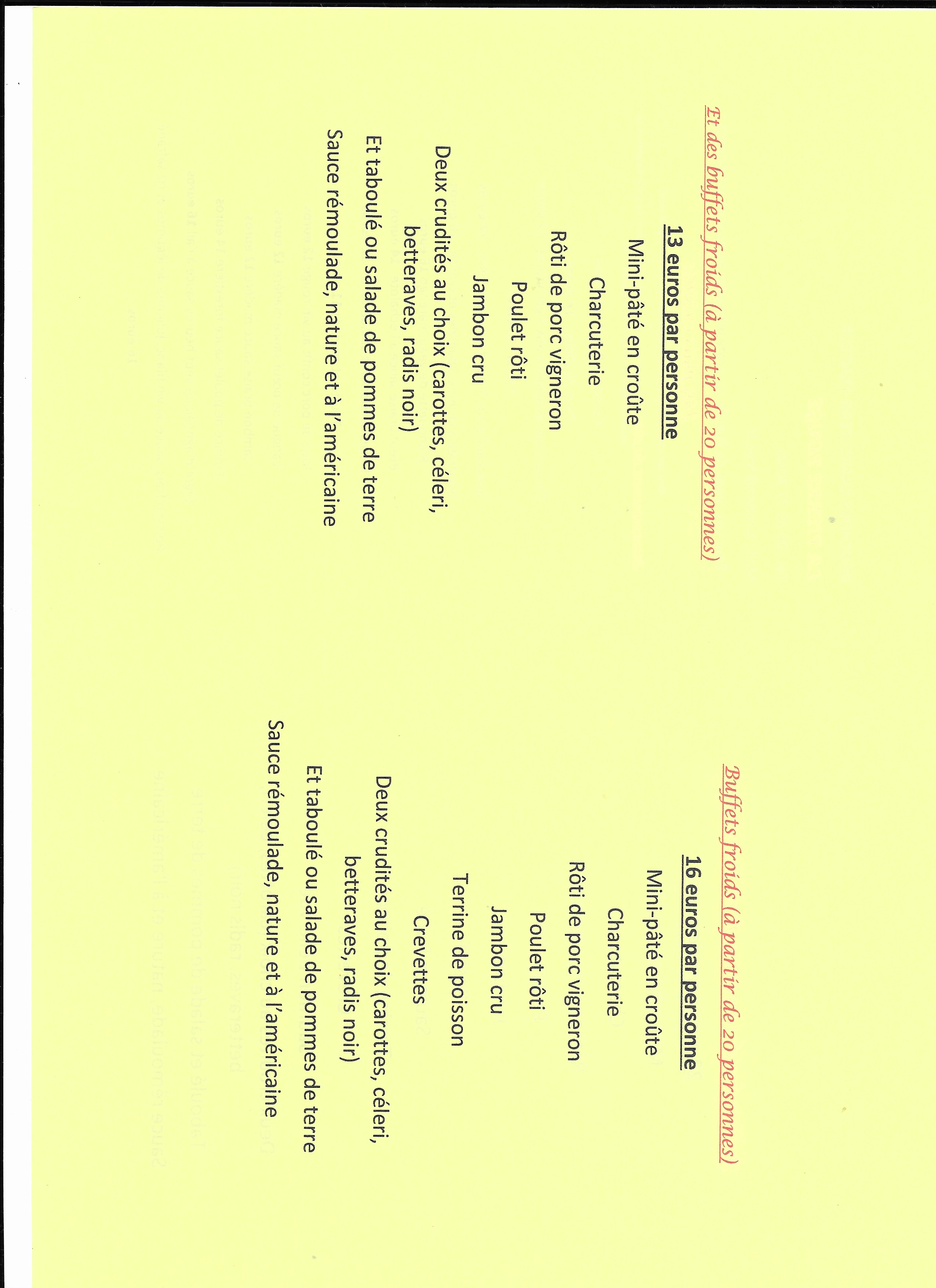 Nous avons également des propositions de plats cuisinés et des buffets froids à partir de 20 personnes pour vos fêtes de famille ou entre amis ou collègues .
